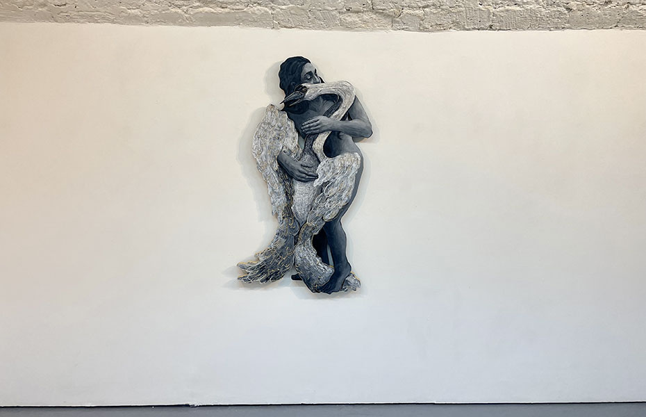 Luján Pérez (born in Madrid in 1991) lives and works in the state of New York, USA. Her studio, located in a barn, is surrounded by an extensive vegetable garden, which is no insignificant detail. She holds a Master’s degree in Fine Arts from the New York Academy of Art since 2020. Her works are simultaneously wall sculptures, engraved paintings, and sculpted engravings. While exploring the relationship between earth and spirit, Luján Pérez has been particularly interested over the past few years by the representation of couples, as the epitome of love and hate, through painting, cinema, photography, and ancient art. With a broad knowledge of herbal remedies, she repurposes their utilitarian function to offer a second reading of her work, like a frame within the frame. Demonstrating her ability to examine and give new meaning to nature’s symbols, she associates a specific plant or flower chosen for its metaphorical power with each image represented in her works. Like in ancient painting, the flowers in Luján Pérez’s works shed light on the meaning of her images. The stinging poison ivy, aphrodisiac ginseng, hallucinogenic datura, psychotropic kanna flower, or the healing power of maple and willow, are symbols used to express her viewpoint on politics, her empathy for a loved one, the irony of a situation, etc.